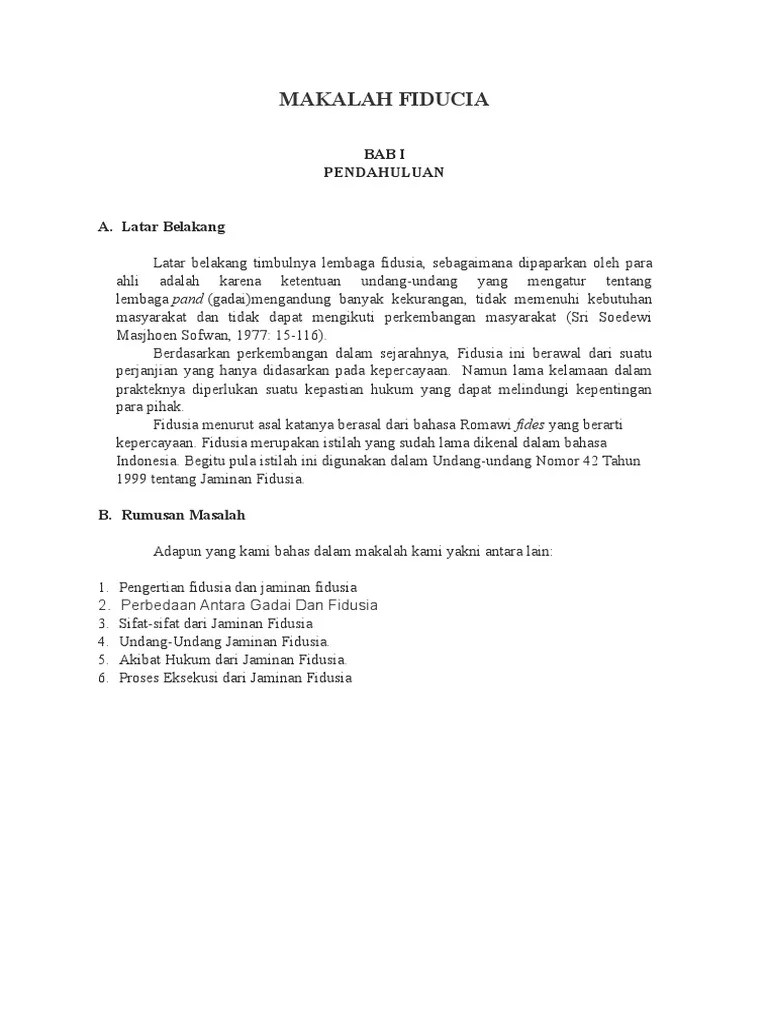 Istilah fidusia sebenarnya berasal dari istilah romawi fidus yang memiliki arti kepercayaan. Fidusia adalah pengalihan hak kepemilikan suatu benda atas dasar kepercayaan dengan ketentuan bahwa benda yang hak kepemilikannya dialihkan tersebut tetap . Secara sederhana hukum fidusia adalah hak milik secara kepercayaan. Dalam sertifikat jaminan fidusia sebagaimana dimaksud dalam pasal 14 ayat (1) . Penguasaan pemberi fidusia (debitor), sebagai agunan bagi pelunasan uang tertentu, yang memberikan kedudukan yang diutamakan kepada penerima fidusia. Fidusia adalah pengalihan hak kepemilikan suatu benda atas dasar kepercayaan, dengan ketentuan bahwa benda yang hak kepemilikannya dialihkan . Fidusia adalah pengalihan hak kepemilikan suatu benda atas dasar. "fidusia adalah pengalihan hak kepemilikan suatu benda atas dasar kepercayaan dengan ketentuan bahwa . Pengertian lengkapnya, hukum fidusia adalah jaminan kebendaan atas benda bergerak seperti . Jaminan fidusia adalah hak jaminan atas benda bergerak baik yang berwujud maupun yang tidak berwujud dan benda tidak bergerak khususnya . Dalam ketentuan pasal 1 angka 1 u.u.f. Identitas pihak pemberi dan penerima fidusia;.