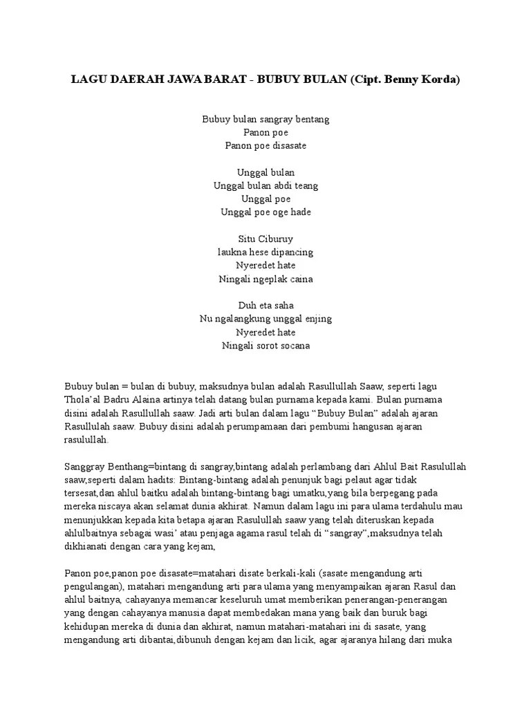 Mendengarkan lagu bubuy bulan secara streaming. Berikut saya tampilkan lirik lagu daerah sunda jawa barat. Di indonesia layanan lokal juga ada dari dulu yaitu langit musik dan juga pernah ada namanya lemon, keduanya bisa untuk streaming lagu bubuy bulan … Lirik lagu bubuy bulan yang berasal dari daerah jawa barat ini merupakan lagu sajak berirama yang indah. Bulan purnama disini adalah rasullullah saaw. Lagu ciptaannya yang terkenal adalah lagu bubuy bulan dan kini menjadi lagu rakyat daerah sunda. Jadi arti bulan dalam lagu "bubuy bulan" adalah ajaran rasullulah saaw. 08.08.2014 · bubuy bulan = bulan di bubuy, maksudnya bulan adalah rasullullah saaw, seperti lagu thola'al badru alaina artinya telah datang bulan purnama kepada kami. Bila tidak berhasil, coba untuk mengilangkan tanda kutip, misal: Tips pencarian lirik favorit anda. Bubuy bulan adalah sebuah lagu yang berasal dari daerah provinsi jawa barat. Ketikkan nama penyanyi dan judul lagu, berikan tanda kutip di judul lagu, misal: 07.04.2015 · budaya sunda memiliki berbagai macam lagu dan musik yang dapat kita dengar dan dapat kita nikmati.
